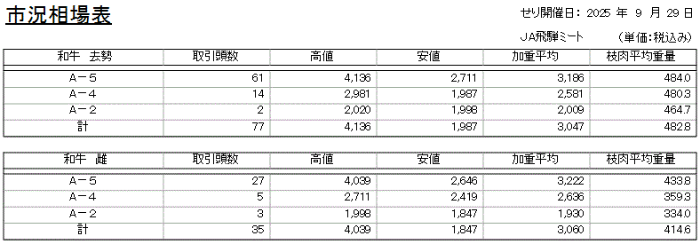 市況コメント 和牛118頭(雌37頭、去勢81頭)のせり市を開催しました。 飛騨牛表示5等級90頭(76.3%)、4等級21頭(17.8%)、3等級0頭でした。 多くの購買者が参加され活発な取引が行われました。 相場も全体的に「上伸」となりました。 総平均単価3,017円(平均枝肉重量457.6kg)でした。 本日の最高取引価格は、和牛去勢 BMS12 税込単価4,136円でした。 文責:作倉 優吾