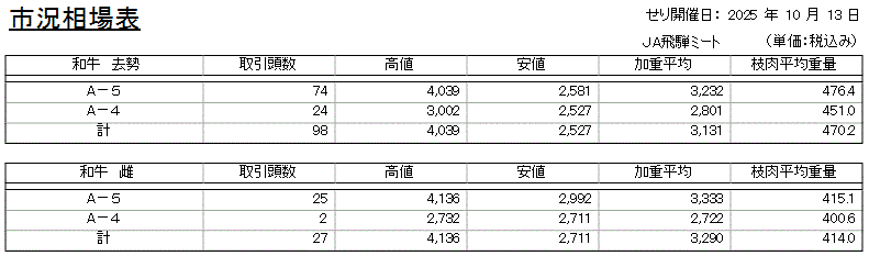 2025年10月13日開催 牛枝肉相場
