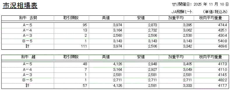 総平均単価3,339円(平均枝肉重量452.0kg)でした。