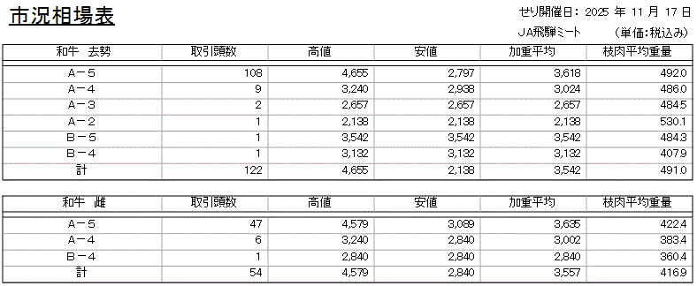 総平均単価3,526円(平均枝肉重量465.7kg)でした。