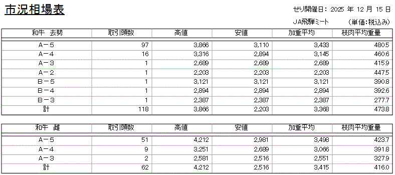 総平均単価3,363円(平均枝肉重量450.9kg)でした。