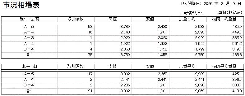 市況コメント 和牛96頭(雌21頭、去勢75頭)のせり市を開催しました。 飛騨牛表示5等級70頭(72.9%)、4等級23頭(24.0%)、3等級1頭(1.0%)でした。 肉付きや歩留りの良くないものを除き、各等級とも「しっかり」相場で取引されました。 総平均単価2,779円(平均枝肉重量457.4kg)でした。 本日の最高取引価格は、和牛雌 BMS12 税込単価3,802円でした。 文責:作倉 優吾