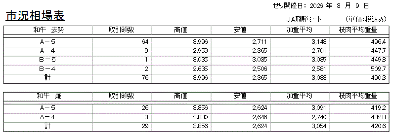 市況コメント 和牛107頭(雌29頭、去勢78頭)のせり市を開催しました。 飛騨牛表示5等級93頭(86.9%)、4等級14頭(13.1%)、3等級0頭でした。 市場全体に活気があり、各等級とも「強気配」の相場となりました。 総平均単価3,068円(平均枝肉重量471.4kg)でした。 本日の最高取引価格は、和牛去勢 BMS12 税込単価3,996円でした。 文責:作倉 優吾