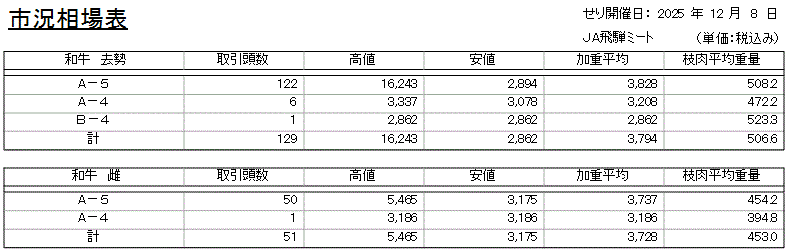 本日の最高取引価格は、和牛去勢 BMS12 税込単価16,243円でした。